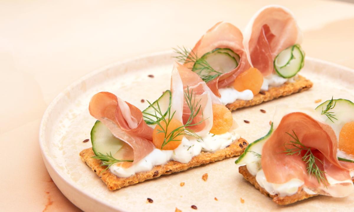 Étalez le tzatziki sur les crackers, garnissez-les de tranches de Culatta, de morceaux de melon et de lamelles de concombre.