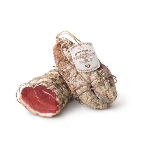 Fiocco di prosciutto stagionato da coscia italiana, la stessa utilizzata per il famoso culatello. Si sceglie la parte anteriore della coscia, la noce del prosciutto, il taglio più piccolo e magro. Salato a mano, poi insaccato nella tradizionale “pelle di sugna” e legato a mano con corda. Segue una stagionatura di almeno 6 mesi. Profumo elegante di cantina, colore rosso rubino e gusto delicato. Disponibile anche in comodo vassoio, affettato con sapienza dai nostri maestri affettatori.